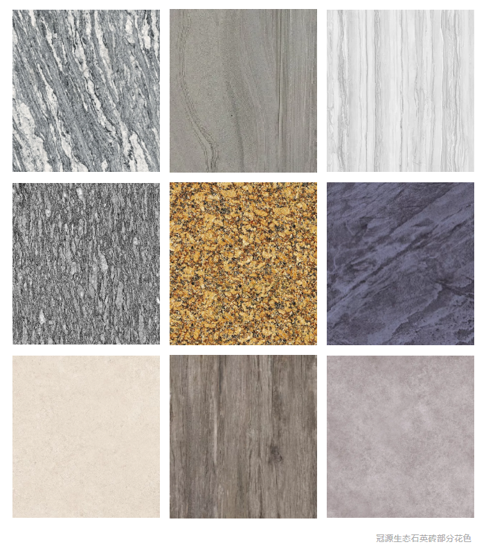冠源生態(tài)石英磚一經(jīng)亮相便驚艷市場,憑借著豐富多樣的花色和時尚大氣的質(zhì)感,與傳統(tǒng)瓷磚的廉價感形成鮮明的對比,讓人感受新穎、別具一格。