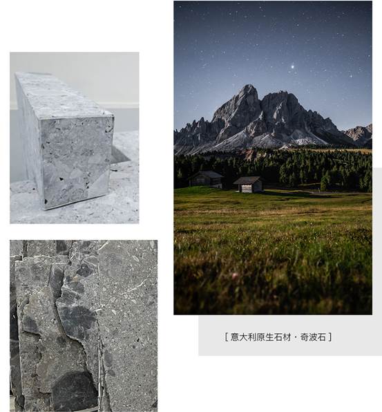 Ceppo 是一種白云質(zhì)角礫巖,它是由破碎的礦物碎片組成的巖石,通過(guò)細(xì)?;|(zhì)粘合在一起,使 Ceppo 具有礫巖外觀。Ceppo di Gre直譯過(guò)來(lái)名叫奇波石。這是一種珍貴稀有的天然石材,產(chǎn)自意大利北部的倫巴第地區(qū)Monte Clemo 山坡上的一個(gè)小鎮(zhèn)。原本是在伊塞奧湖岸邊的藍(lán)灰色沉積巖,也可以被稱(chēng)為是一種沉積的白云質(zhì)角礫巖,由大塊和較小的生動(dòng)藍(lán)灰色石頭組成,與較淺和較暖的灰色形成鮮明對(duì)比。