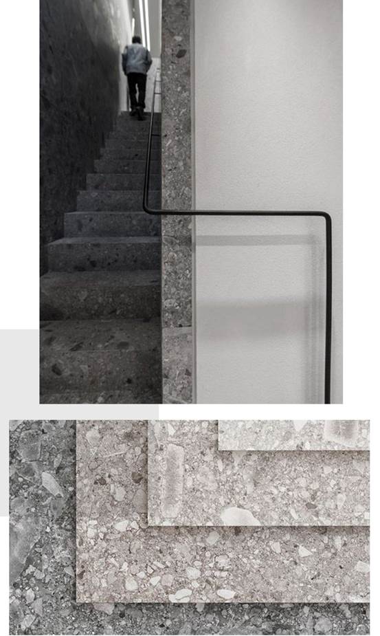 初次看到奇波石時(shí),雖然讓人聯(lián)想到人造水磨石,但Ceppo di Gre是一種多孔、自然發(fā)生的灰藍(lán)色優(yōu)質(zhì)觀賞石,從淺色調(diào)到深色調(diào),化學(xué)成分非常均勻,碎屑的形態(tài)和大小多變且分布不規(guī)則,散發(fā)著優(yōu)雅的迷人氣質(zhì)。各個(gè)元素的尺寸從幾厘米到幾分米不等,賦予巖石典型的“粗糙”外觀,并保證每塊石板都是獨(dú)一無(wú)二的。